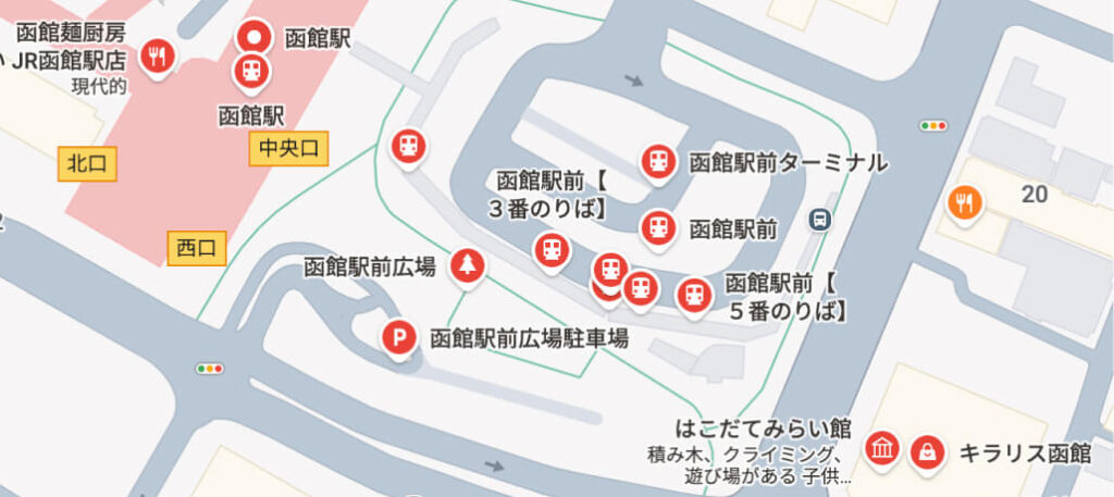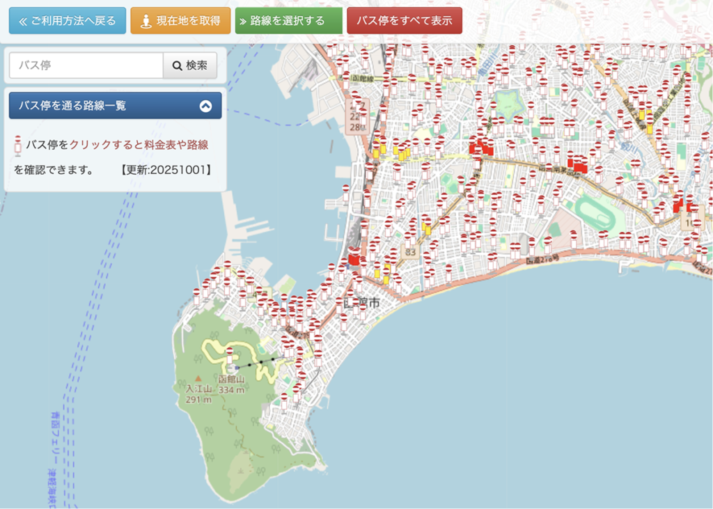 地図に函館バスのバス停を全て表示します。(初期画面では全てのバス停が表示されています。)