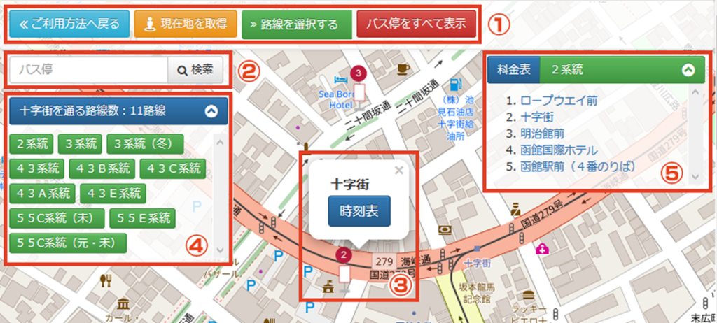 ④路線一覧表示部の各路線ボタンをクリックするとその路線が経由するバス停一覧を表示します。