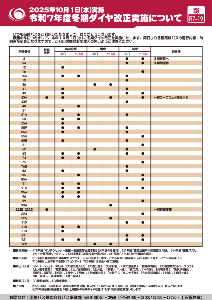 標題の件につきまして、函館バス株式会社では、2025年10月1日(水)にダイヤ改正を実施いたします。