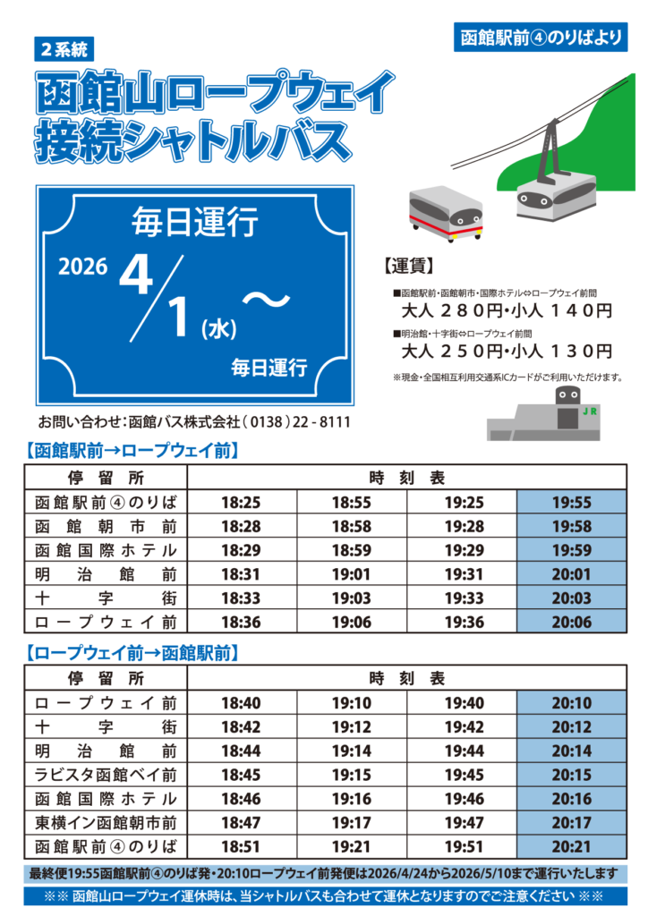 函館山登山道開通が延期となった場合は、その内容に準じます。運行スケジュールは後日お知らせ申し上げます。