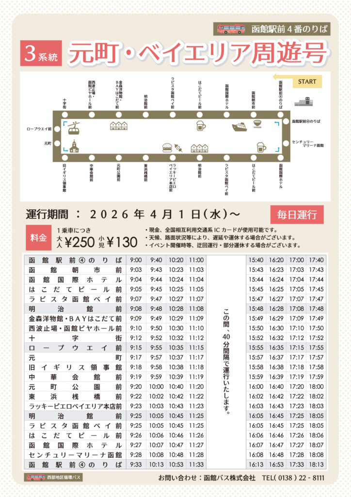 標題の件につきまして、2026(令和8)年4月1日(水)以降の、各種観光路線バスの運行内容をお知らせ申し上げます。