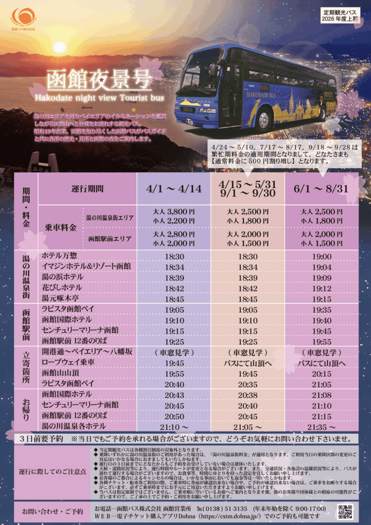 ご予約先…函館バス株式会社 函館営業所 ☎0138-51-3135(年末年始を除く9:00~17:00)