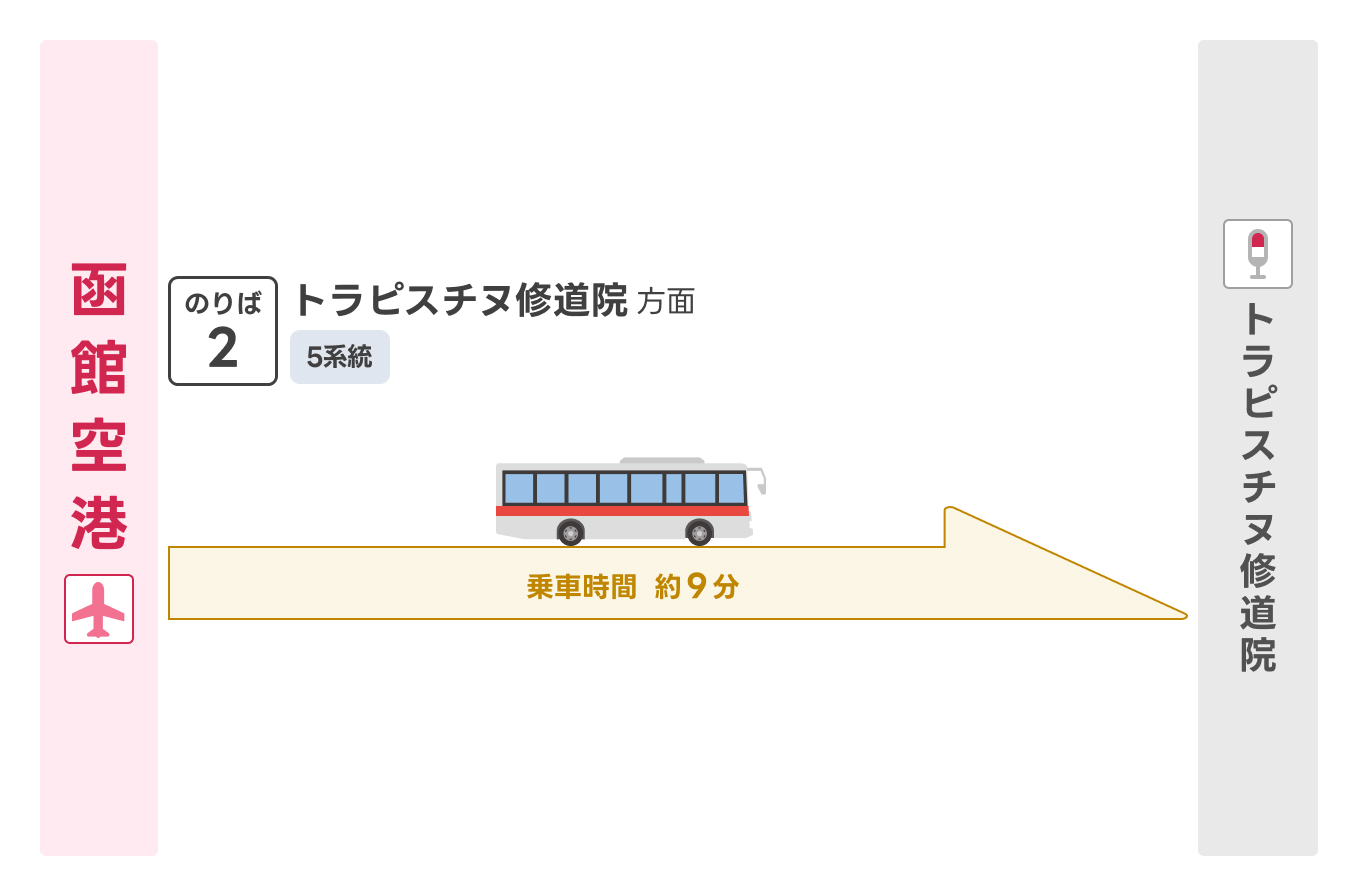 | 函館空港 | トラピスチヌ修道院 | 2番のりば | 5系統 | 9分 |