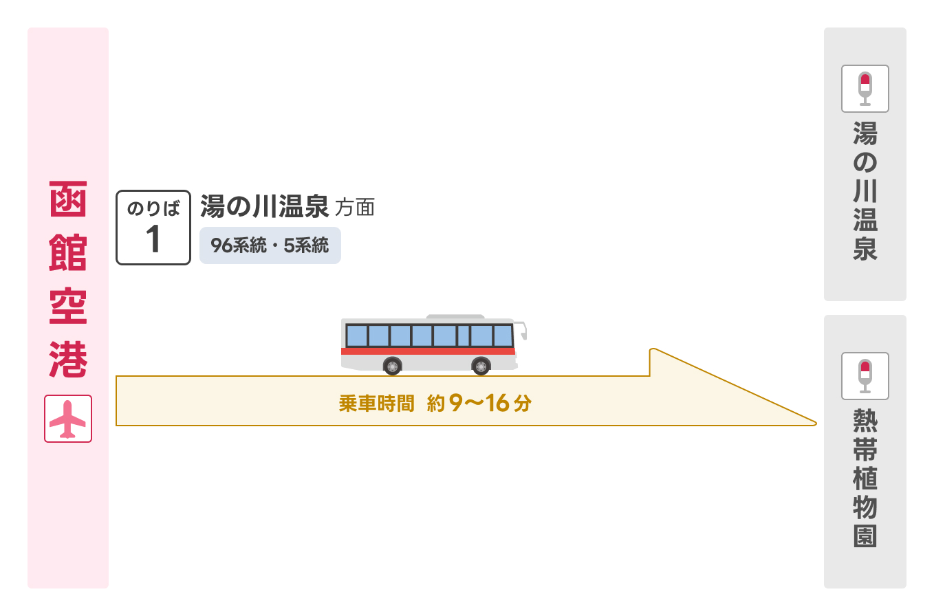 | 函館空港 | 湯の川温泉 ・ 熱帯植物園 | 1番のりば | 96系統 | 16分 |