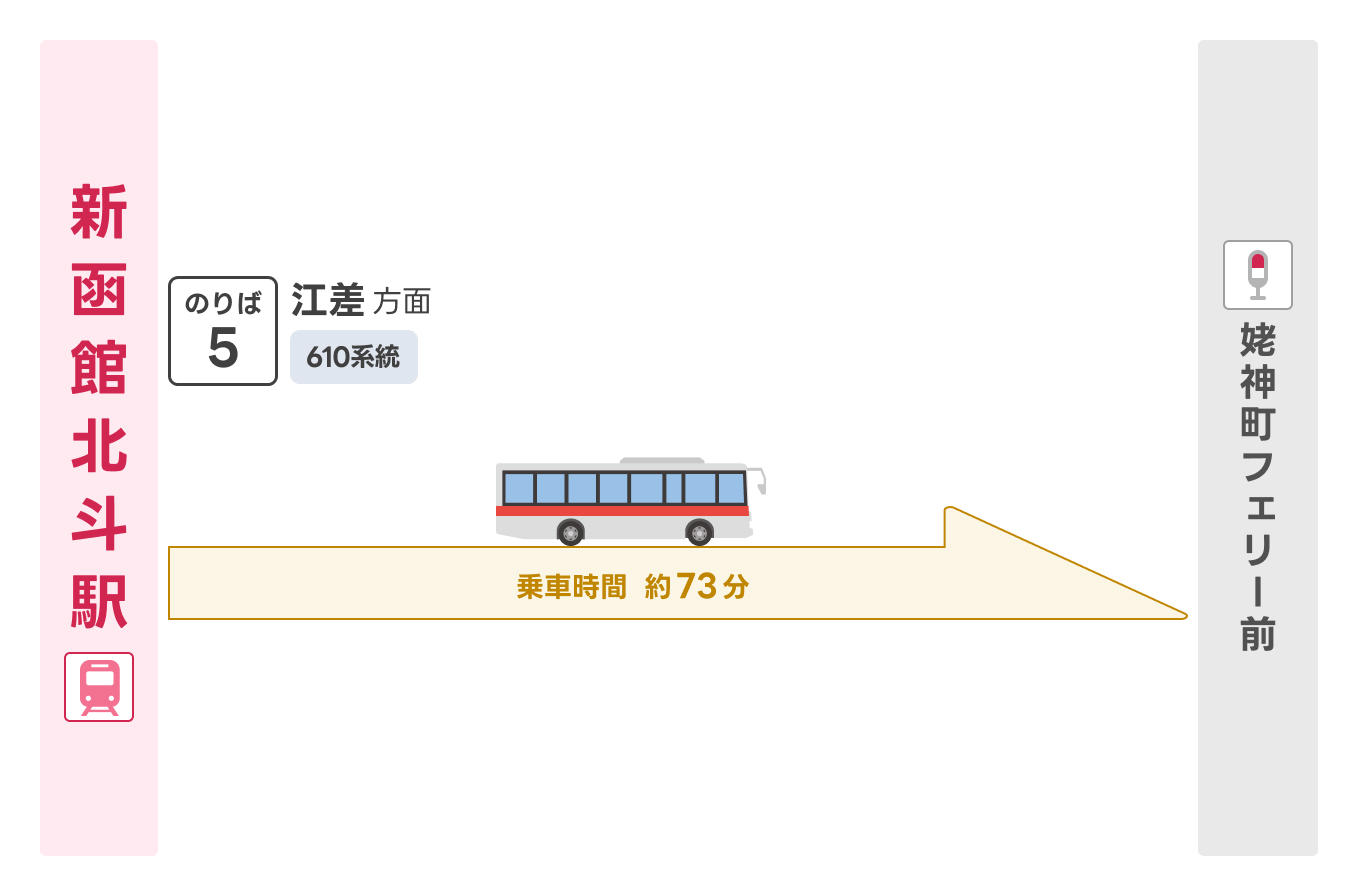 | 新函館北斗駅 | 姥神町フェリー前 | 5番のりば | 610系統 | 73分 |