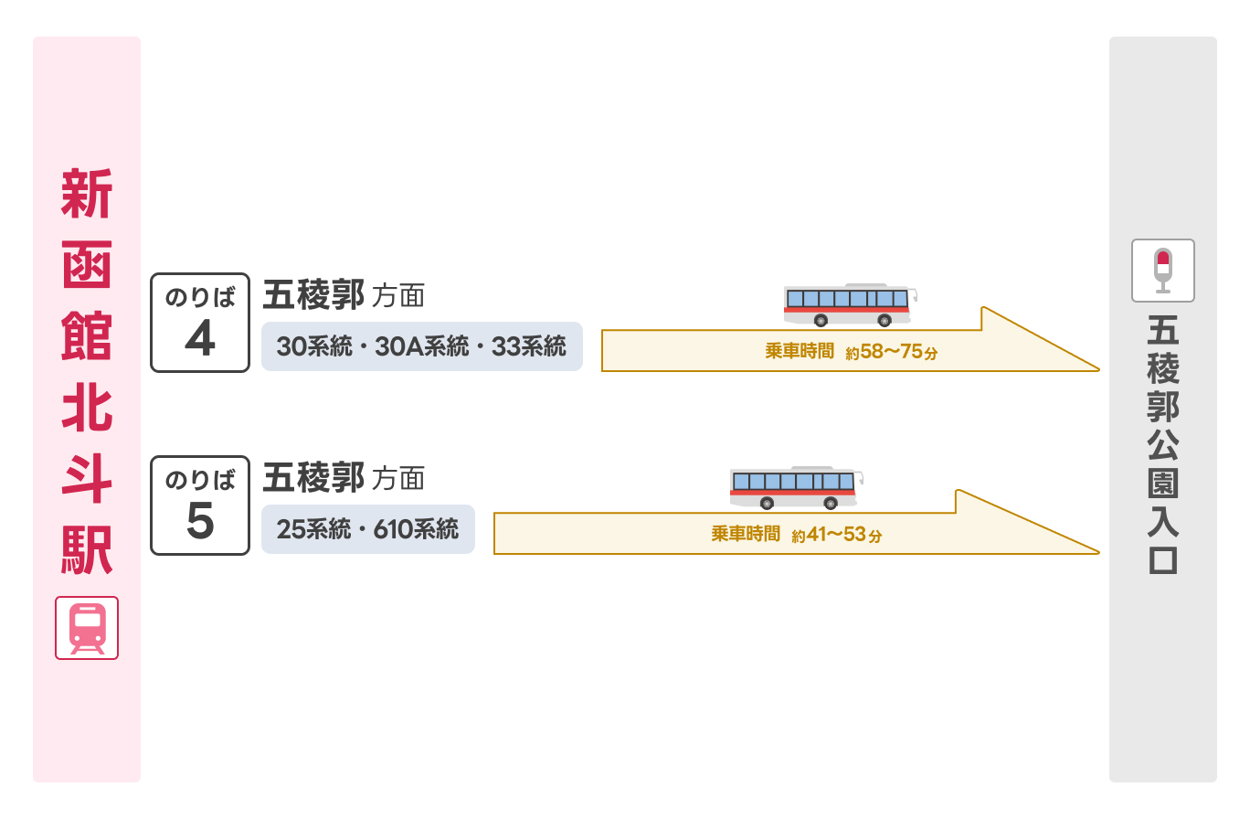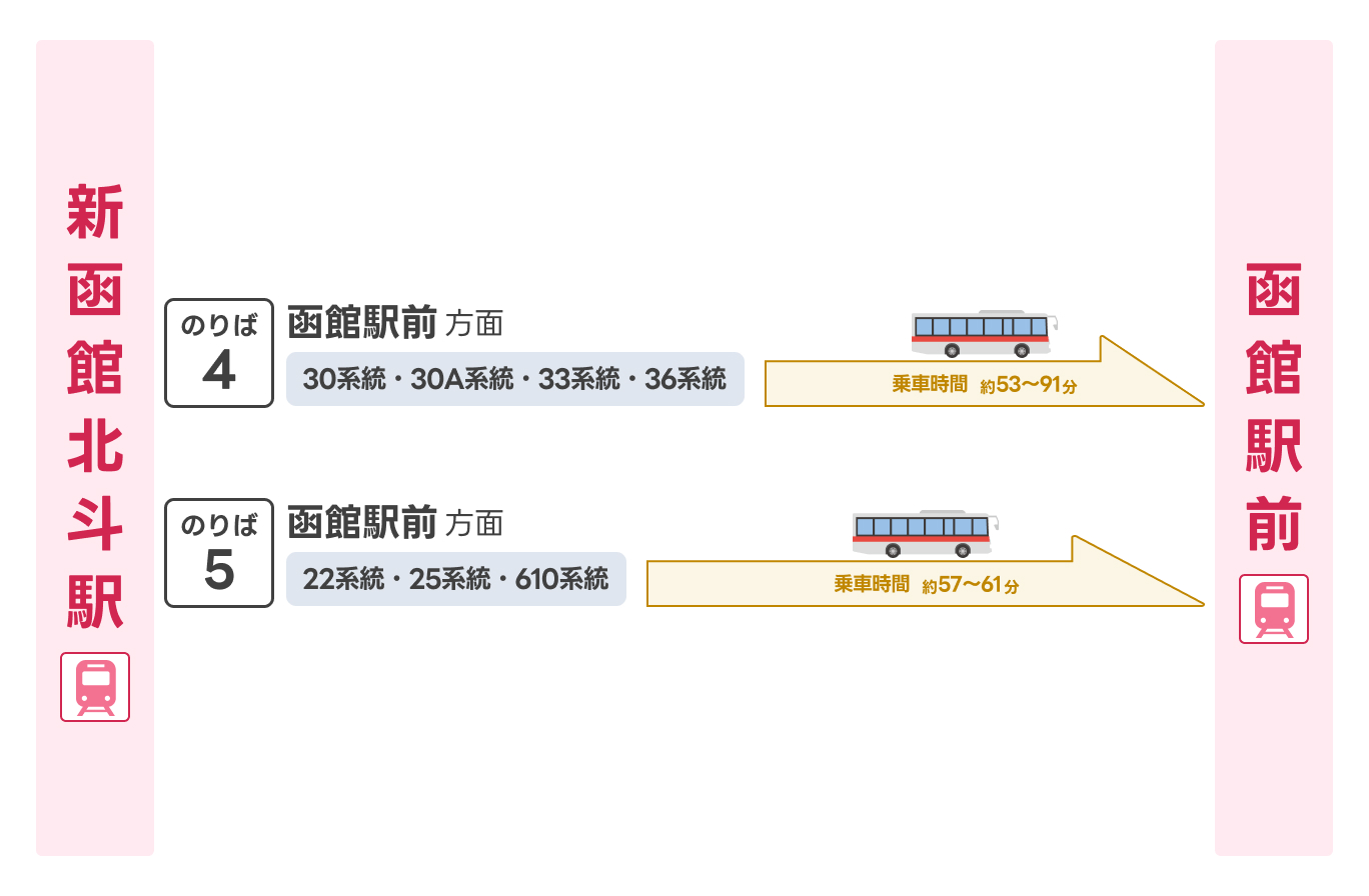 | 新函館北斗駅 | 五稜郭公園入口 | 4番のりば | 30/30A系統 | 66~75分 |