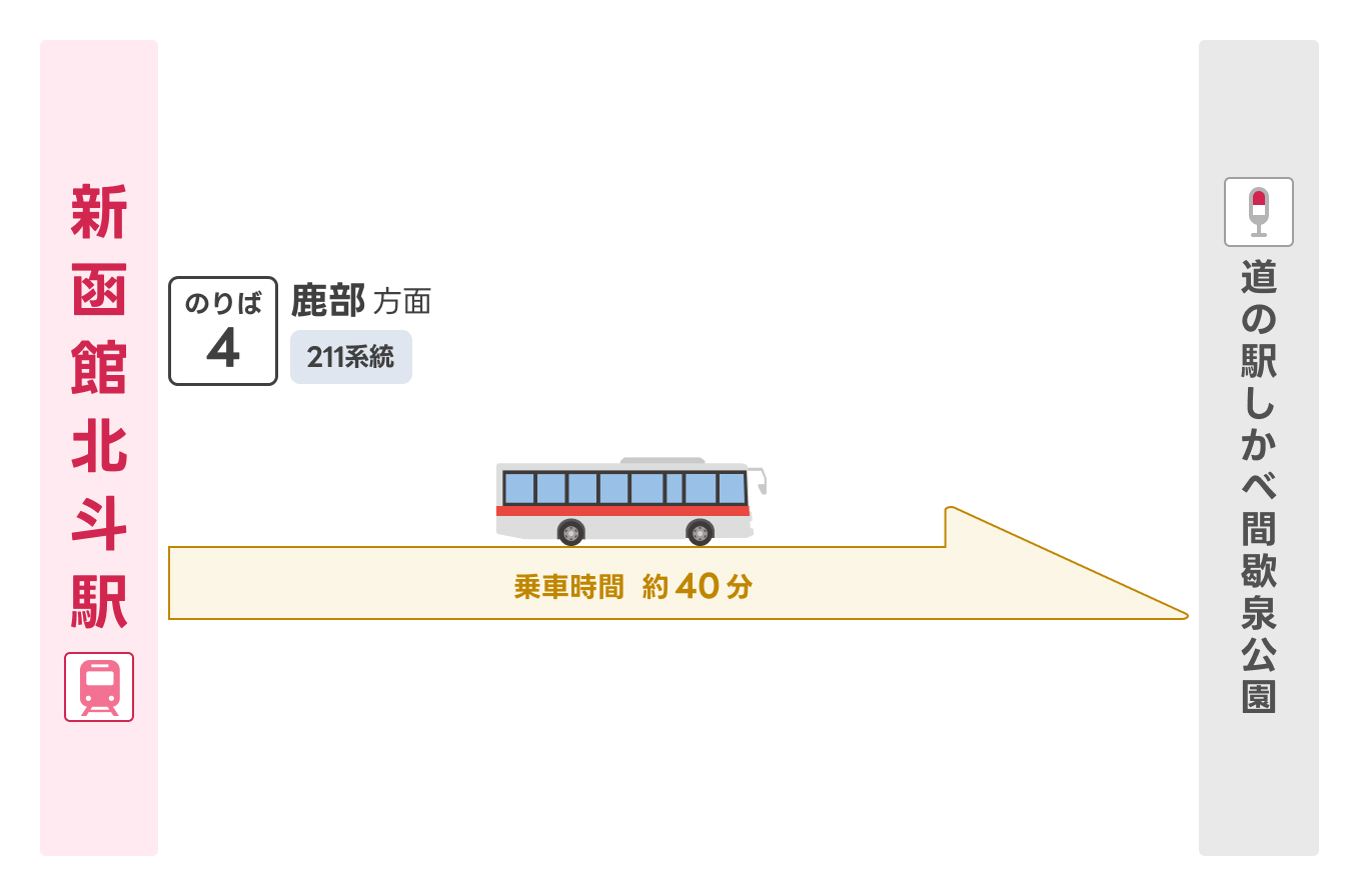 | 新函館北斗駅 | 道の駅しかべ間歇泉公園 | 4番のりば | 211系統 | 40分 |